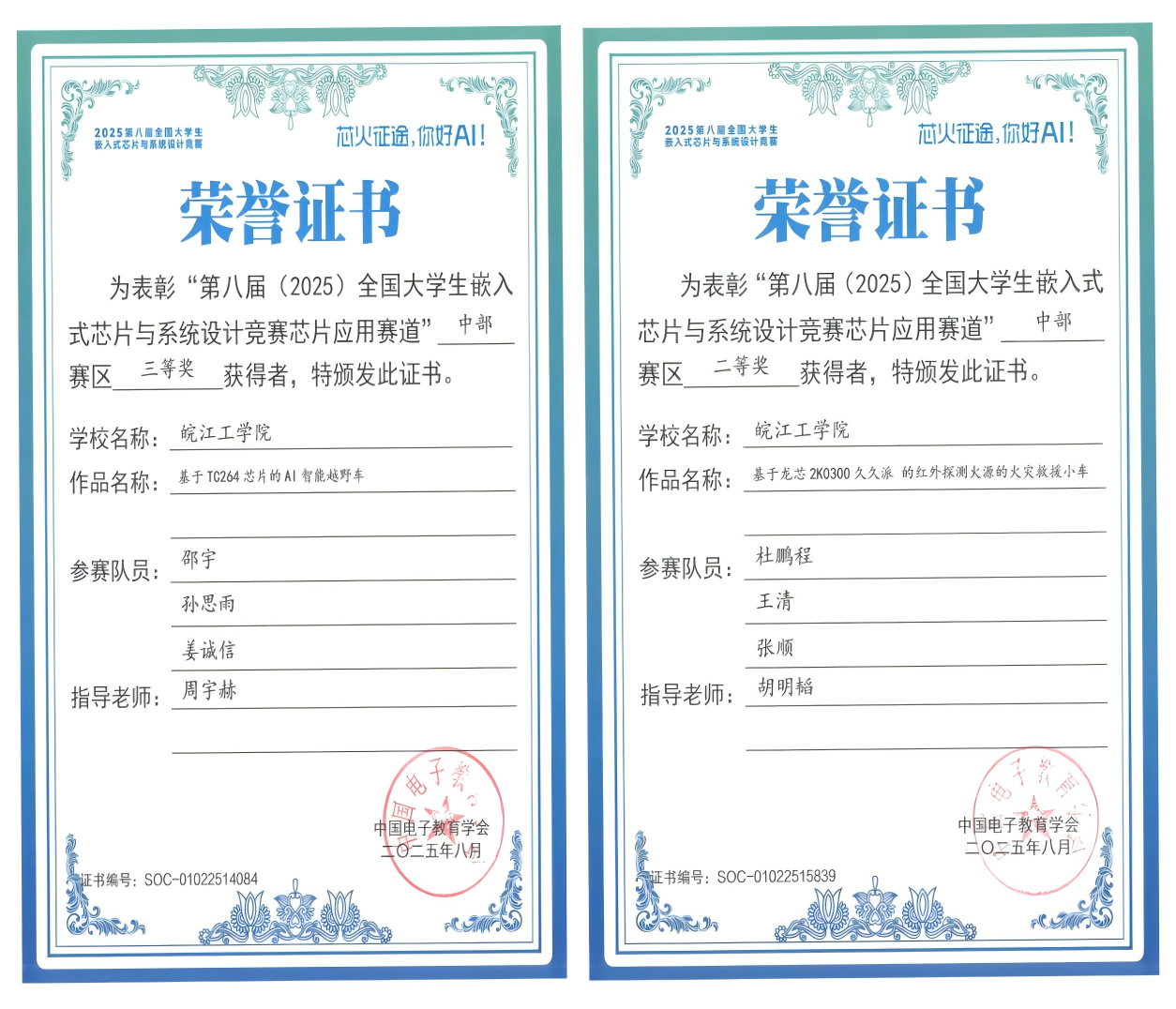 近日,第八届全国大学生嵌入式芯片与系统设计竞赛分赛区评审结果正式公布。皖江工学院电信工程学院参赛队伍凭借出色的创新能力和扎实的专业技术功底,在中部赛区的激烈角逐中脱颖而出,荣获赛区二等奖一项、三等奖一项的优异成绩,充分展现了学院在嵌入式系统设计与应用领域的教学成果和学子的实践创新能力。