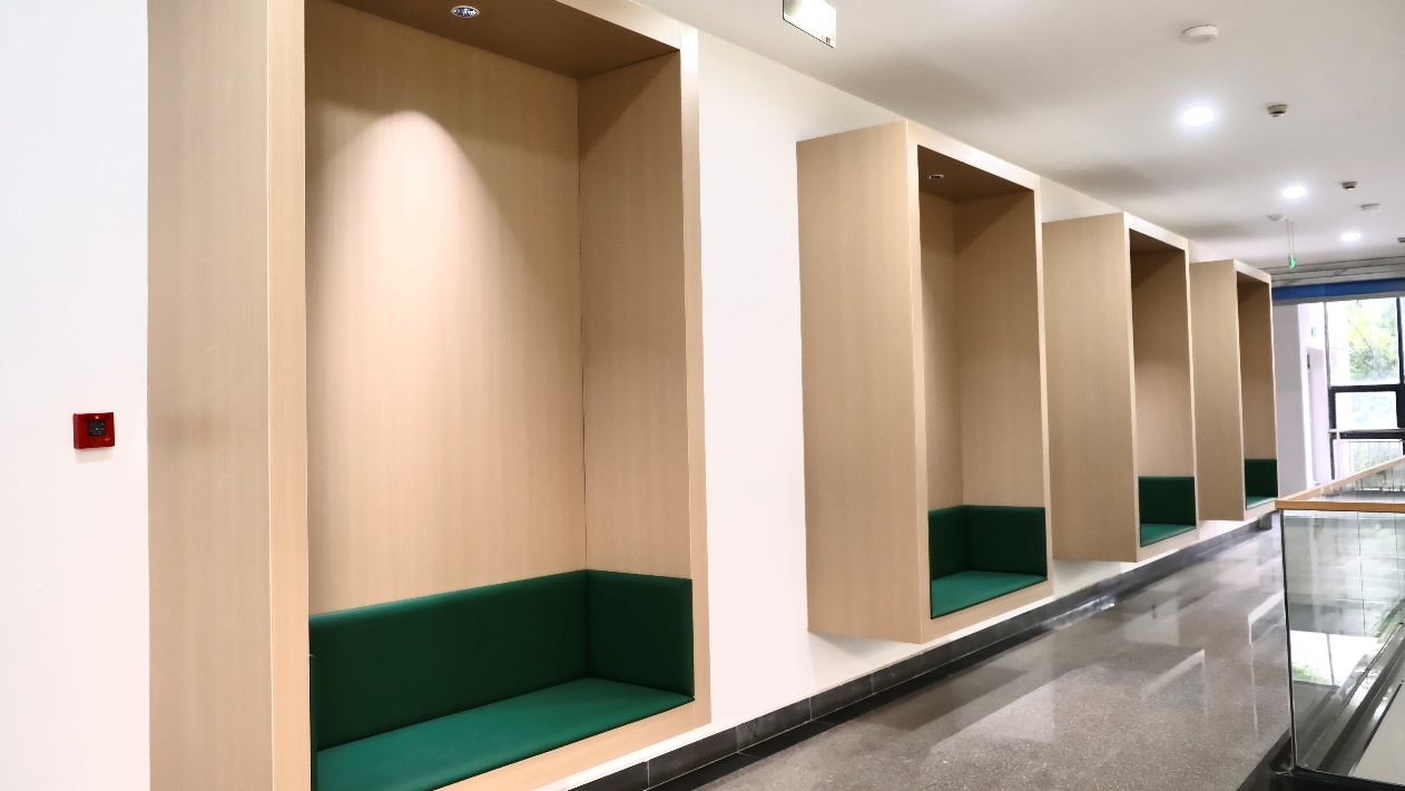 改造工程特别注重空间的多功能性与灵活性,随处可见的阅读区,不拘泥于桌子椅子,墙边、楼梯上也可以阅读。旨在通过物理环境的改变,促进人与人、人与知识之间的连接,激发更多创新思维的火花。在休闲阅读区配备了舒适的沙发和茶几,让读者在轻松的氛围中享受阅读的乐趣。