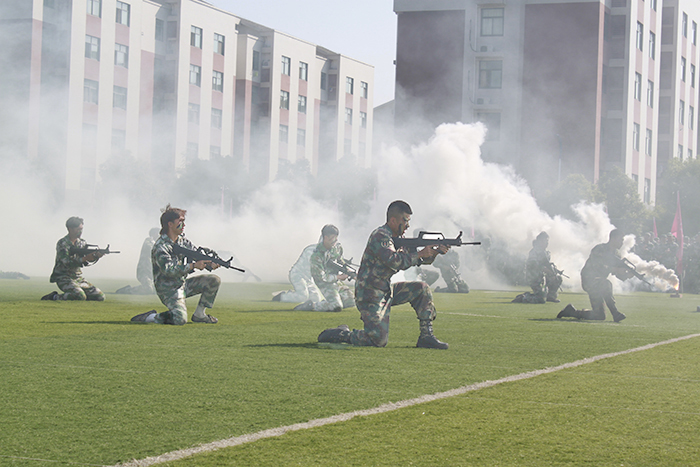 女子匕首格斗术、男子长枪格斗术表演接踵而来。2021级新生们画着迷彩装,尖刃出鞘,长枪来袭,一招一式敏捷有力,英勇无畏。“噼啪”声响,烟雾弥漫,男子综合战术表演开始。朦胧烟雾中,一道道身影手持枪械,卧倒、匍匐、跪滑……在精彩纷呈的汇报表演中,皖江工学院新生们展现了爱党爱国的青春底色。