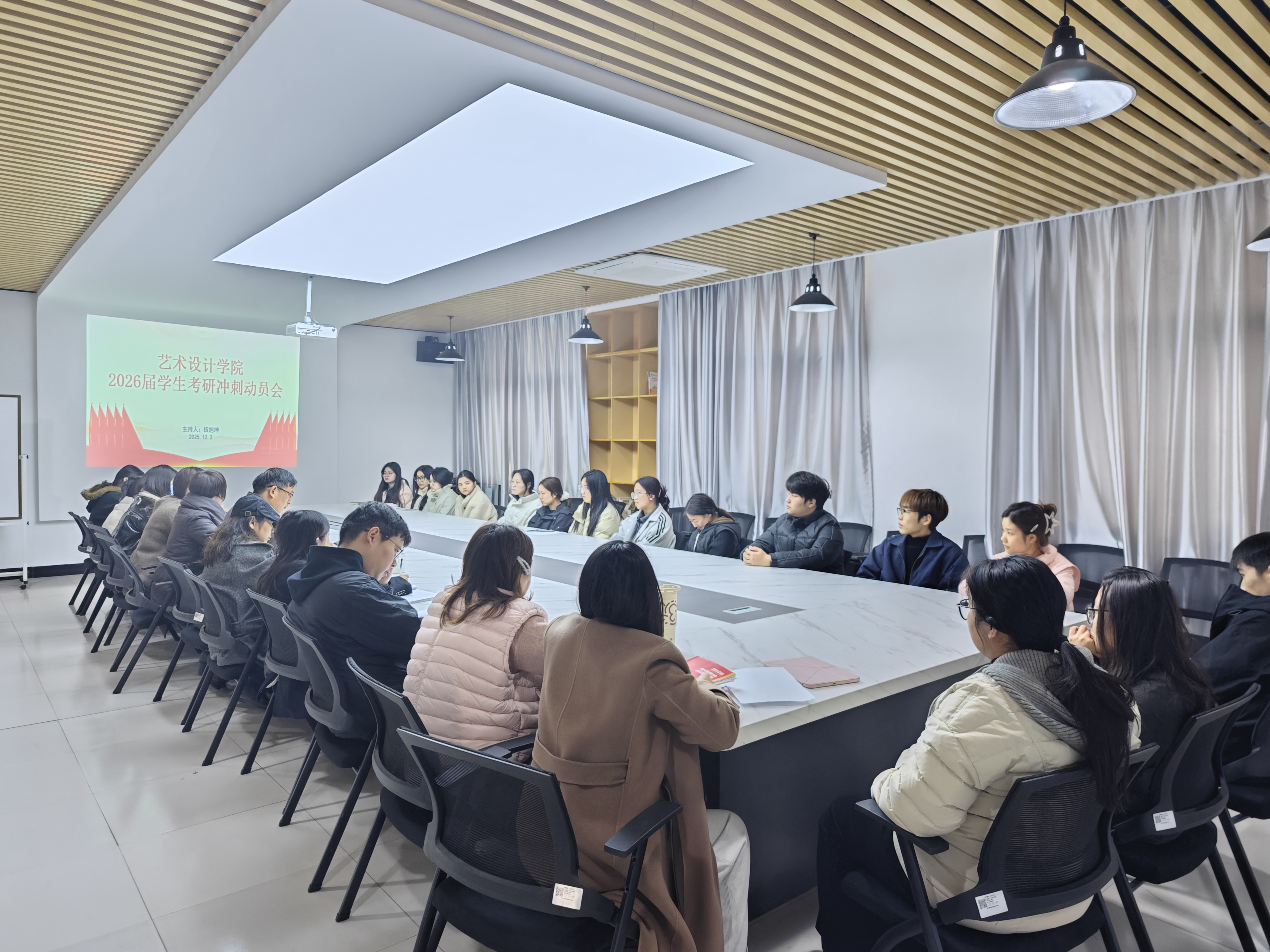 在2025年考研进入最后冲刺阶段的关键时期,艺术设计学院于12月2日在洪雅楼203会议室召开26届学生考研冲刺动员会,为全力备战的2025年考研学子送去温暖关怀与务实支持‌。学院党政领导、毕业班辅导员、班主任及全体2026届考研学生参会,会议由学院党总支书记张亚梅主持。