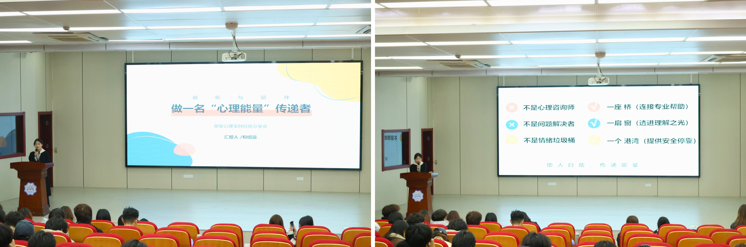 12月18日中午,第二场分享会在霍里山校区东教楼105报告厅接续举办,对象主要为2023级全体及2022级部分心理委员与心理信息员。校大学生心理委员会分管宣传部主席梁静与分管办公室主席袁莉共同担任主讲。梁静以“用爱倾听,用心陪伴”为核心,深度讲解了如何通过积极倾听与有效回应建立信任关系;袁莉则聚焦“心理信息员的职责与担当”,明确了岗位的日常观测、信息上报及协同联动等具体职责。