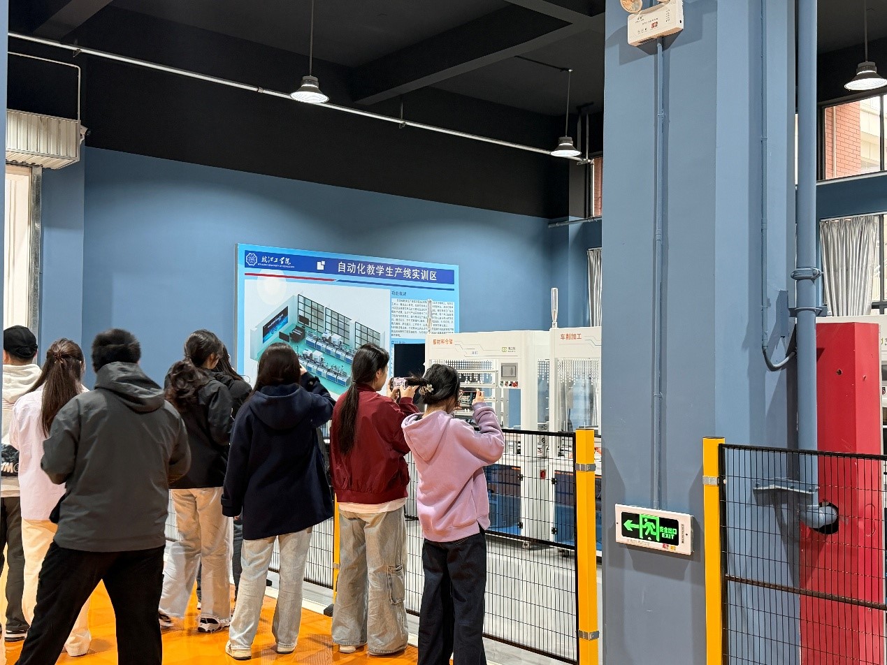 作为本次参观的重点区域,智能制造实训车间的现代化设备全方位展现了“工业4.0”的技术魅力。在工业机器人区,讲解员生动演示了机器人协同装配流程,深入剖析了智能装备在大型水利工程自动化运维中的应用前景;自动化教学生产线所呈现的“虚拟建模-仿真优化-实体应用”全流程,让皖工学子深刻理解了现代工程逻辑。参观过程中,不少学生认真记录关键技术要点,就技术细节与老师展开热烈探讨,求知氛围浓厚。