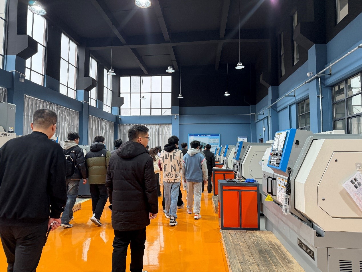 在实训中心老师的引导下,皖工学子们严格遵循安全规范,依次深入机加工实训车间、智能制造实训车间和基础教学实训车间开展系统观摩。机加工实训车间内,整齐排列的数控车床、数控铣床等设备吸引了学子们的目光,讲解员围绕零部件加工需求,详细解读了数控车床操作原理、数控铣床加工精度控制等核心知识点,让学子对机械加工基础有了直观认知。
